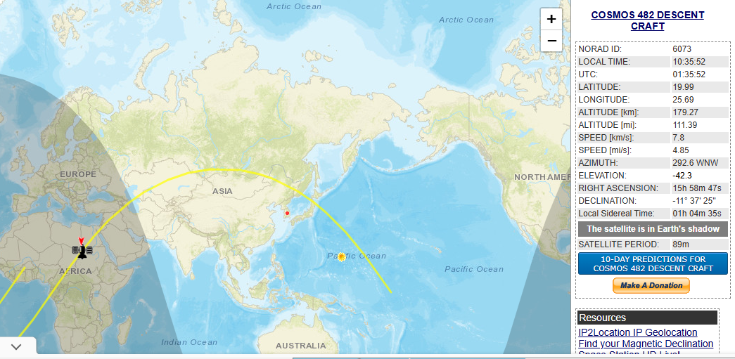 코스모스 482는 현재 고도 179.27에서 초속 7.8km/s으로 돌며 초당 약 50~100m씩 하강하고 있다.